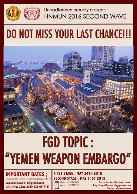 documents before May 22nd 2015 (23.00 WIB) to unpadhnmun2016@gmail.com with the subject “2ndWave_Name_Faculty”